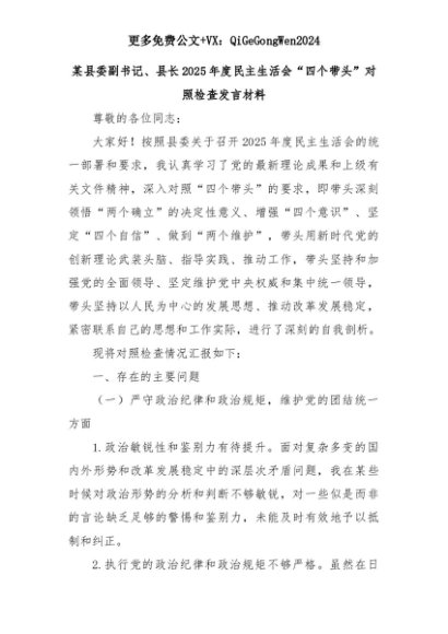 【七哥公文】2025年:某县委副书记、县长2025年度民主生活会“四个带头”对照检查发言材料+更多免费公文+VX:QiGeGongWen2024+更多免费公文+VX:QiGeGongWen2024