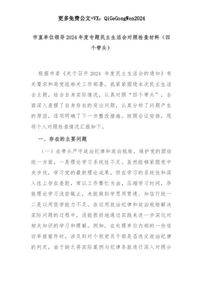 【七哥公文】2025年:市直单位领导2024年度专题民主生活会对照检查材料(四个带头)+更多免费公文+VX:QiGeGongWen2024+更多免费公文+VX:QiGeGongWen2024