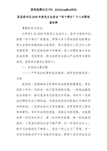 【七哥公文】2025年:某县委书记2025年度民主生活会“四个带头”个人对照检查材料+更多免费公文+VX:QiGeGongWen2024+更多免费公文+VX:QiGeGongWen2024