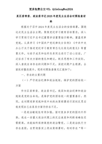 【七哥公文】2025年:某区委常委、政法委书记2025年度民主生活会对照检查材料+更多免费公文+VX:QiGeGongWen2024+更多免费公文+VX:QiGeGongWen2024