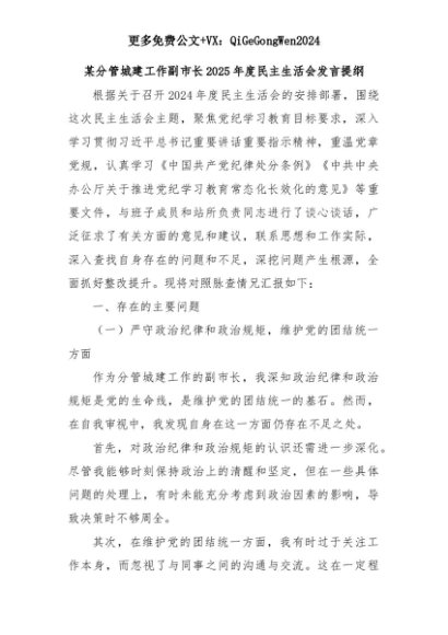 【七哥公文】2025年:某分管城建工作副市长2025年度民主生活会发言提纲+更多免费公文+VX:QiGeGongWen2024+更多免费公文+VX:QiGeGongWen2024