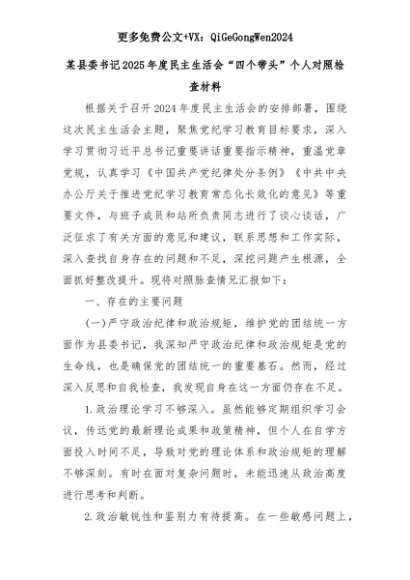 【七哥公文】2025年:某县委书记2025年度民主生活会“四个带头”个人对照检查材料 (2)+更多免费公文+VX:QiGeGongWen2024+更多免费公文+VX:QiGeGongWen2024