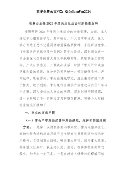 【七哥公文】2025年:巡察办主任2024年度民主生活会对照检查材料+更多免费公文+VX:QiGeGongWen2024+更多免费公文+VX:QiGeGongWen2024