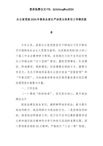 【七哥公文】2025年:办公室党组2024年落实全面从严治党主体责任工作情况报告+更多免费公文+VX:QiGeGongWen2024+更多免费公文+VX:QiGeGongWen2024