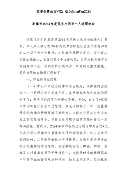 【七哥公文】2025年:副镇长2024年度民主生活会个人对照检查+更多免费公文+VX:QiGeGongWen2024+更多免费公文+VX:QiGeGongWen2024