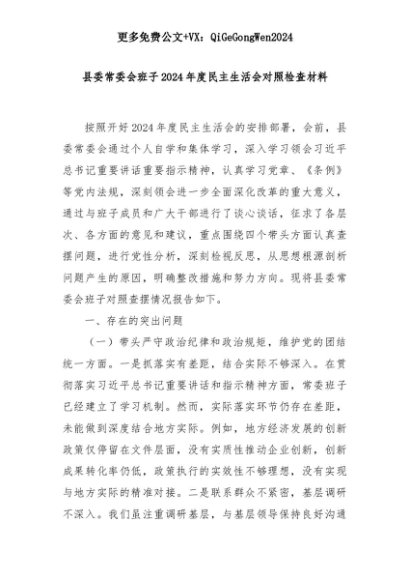【七哥公文】2025年:县委常委会班子2024年度民主生活会对照检查材料+更多免费公文+VX:QiGeGongWen2024+更多免费公文+VX:QiGeGongWen2024