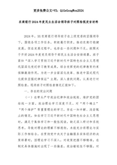 【七哥公文】2025年:农商银行2024年度民主生活会领导班子对照检视发言材料+更多免费公文+VX:QiGeGongWen2024+更多免费公文+VX:QiGeGongWen2024