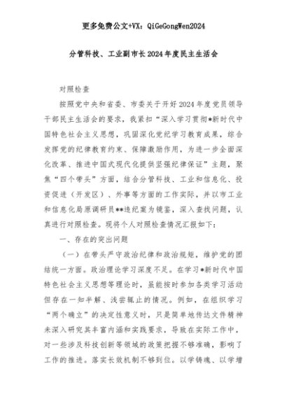 【七哥公文】2025年:分管科技、工业副市长2024年度民主生活会+更多免费公文+VX:QiGeGongWen2024+更多免费公文+VX:QiGeGongWen2024