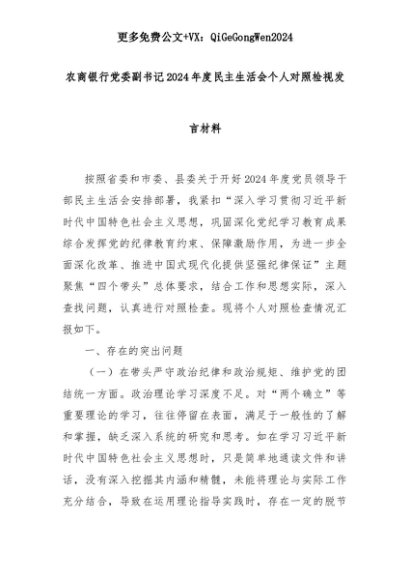 【七哥公文】2025年:农商银行党委副书记2024年度民主生活会个人对照检视发言材料+更多免费公文+VX:QiGeGongWen2024+更多免费公文+VX:QiGeGongWen2024