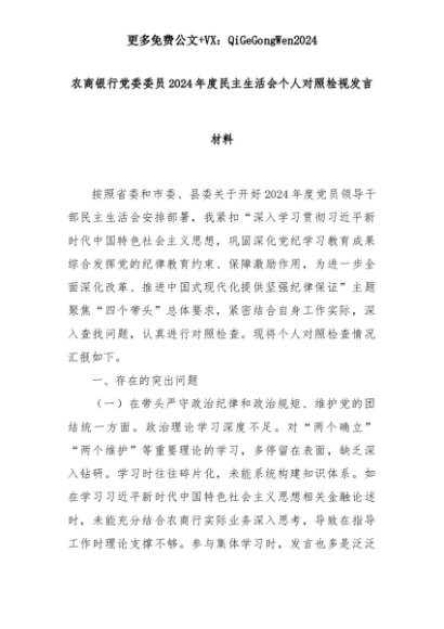 【七哥公文】2025年:农商银行党委委员2024年度民主生活会个人对照检视发言材料+更多免费公文+VX:QiGeGongWen2024+更多免费公文+VX:QiGeGongWen2024