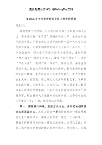 【七哥公文】2025年:在2025年全市宣传部长会议上的讲话提纲+更多免费公文+VX:QiGeGongWen2024+更多免费公文+VX:QiGeGongWen2024