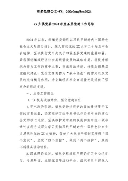 【七哥公文】2025年:xx乡镇党委2024年度基层党建工作总结+更多免费公文+VX:QiGeGongWen2024+更多免费公文+VX:QiGeGongWen2024