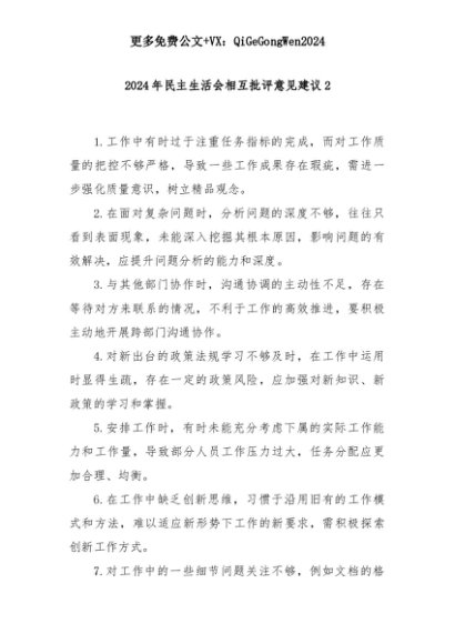 【七哥公文】2025年:2024年民主生活会相互批评意见建议2+更多免费公文+VX:QiGeGongWen2024+更多免费公文+VX:QiGeGongWen2024