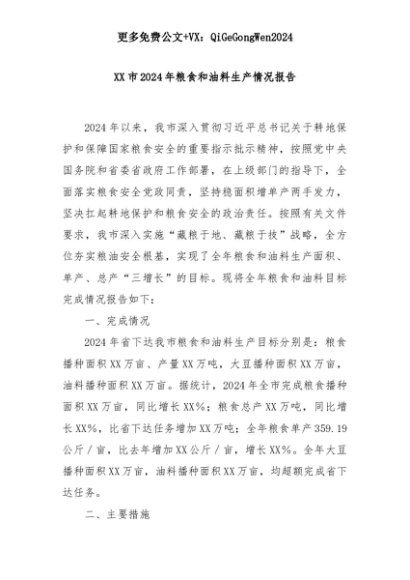 【七哥公文】2025年:XX市2024年粮食和油料生产情况报告+更多免费公文+VX:QiGeGongWen2024+更多免费公文+VX:QiGeGongWen2024