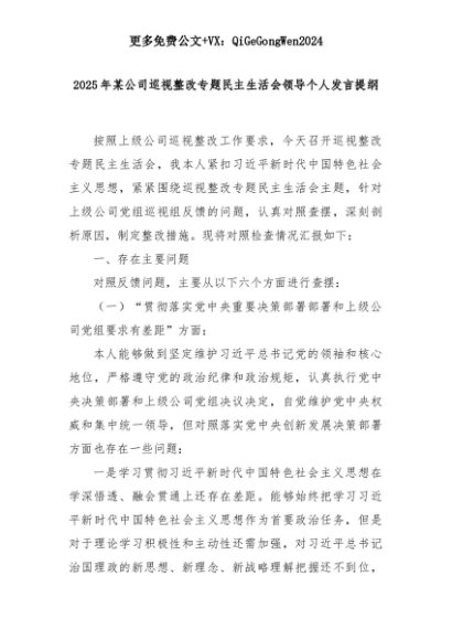 【七哥公文】2025年:2025年某公司巡视整改专题民主生活会领导个人发言提纲+更多免费公文+VX:QiGeGongWen2024+更多免费公文+VX:QiGeGongWen2024