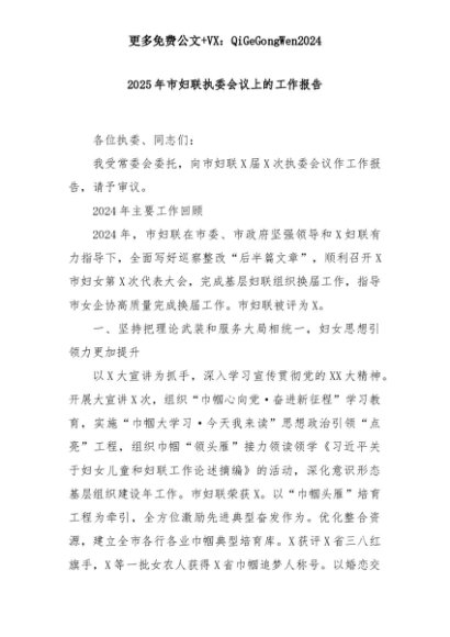 【七哥公文】2025年:2025年市妇联执委会议上的工作报告+更多免费公文+VX:QiGeGongWen2024+更多免费公文+VX:QiGeGongWen2024