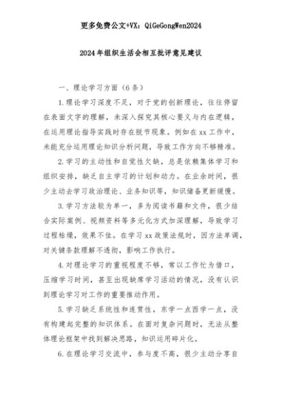 【七哥公文】2025年:2024年组织生活会相互批评意见建议+更多免费公文+VX:QiGeGongWen2024+更多免费公文+VX:QiGeGongWen2024