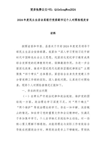 【七哥公文】2025年:2024年度民主生活会某银行党委副书记个人对照检视发言材料+更多免费公文+VX:QiGeGongWen2024+更多免费公文+VX:QiGeGongWen2024