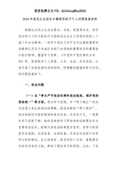 【七哥公文】2025年:2024年度民主生活会乡镇领导班子个人对照检查材料+更多免费公文+VX:QiGeGongWen2024+更多免费公文+VX:QiGeGongWen2024
