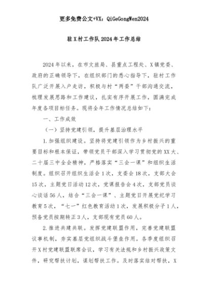【七哥公文】2025年:驻X村工作队2024年工作总结+更多免费公文+VX:QiGeGongWen2024+更多免费公文+VX:QiGeGongWen2024