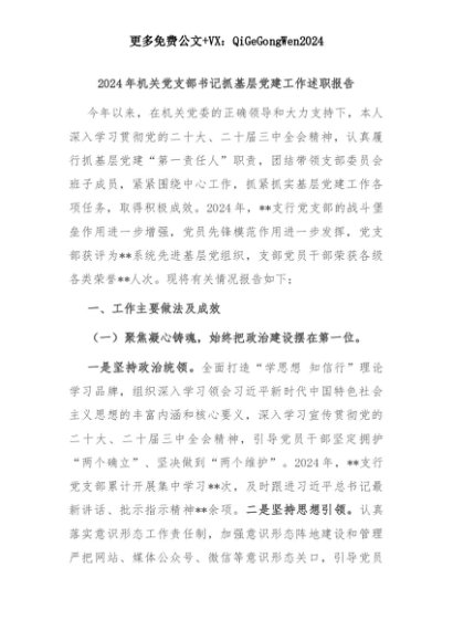 【七哥公文】2025年:2024年机关党支部书记抓基层党建工作述职报告+更多免费公文+VX:QiGeGongWen2024+更多免费公文+VX:QiGeGongWen2024