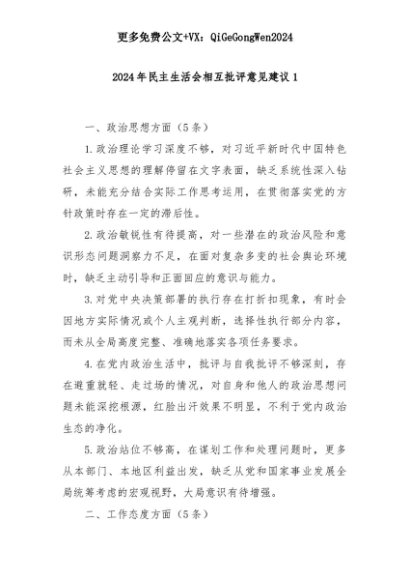 【七哥公文】2025年:2024年民主生活会相互批评意见建议1+更多免费公文+VX:QiGeGongWen2024+更多免费公文+VX:QiGeGongWen2024