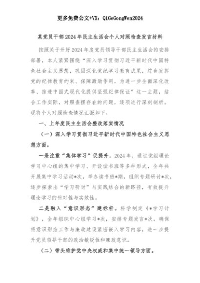 【七哥公文】2025年:某党员干部2024年民主生活会个人对照检查发言材料+更多免费公文+VX:QiGeGongWen2024+更多免费公文+VX:QiGeGongWen2024