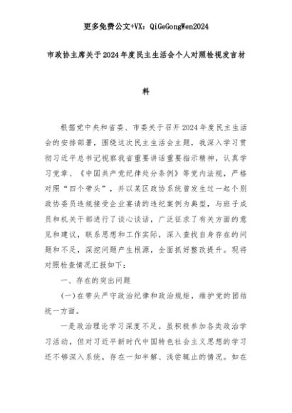 【七哥公文】2025年:市政协主席关于 2024 年度民主生活会个人对照检视发言材料+更多免费公文+VX:QiGeGongWen2024+更多免费公文+VX:QiGeGongWen2024