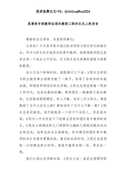 【七哥公文】2025年:某高校专职教师在退休教职工荣休仪式上的发言+更多免费公文+VX:QiGeGongWen2024+更多免费公文+VX:QiGeGongWen2024