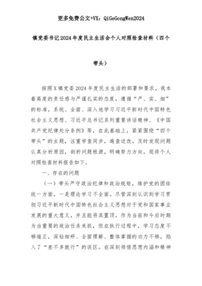【七哥公文】2025年:镇党委书记2024年度民主生活会个人对照检查材料(四个带头)+更多免费公文+VX:QiGeGongWen2024+更多免费公文+VX:QiGeGongWen2024
