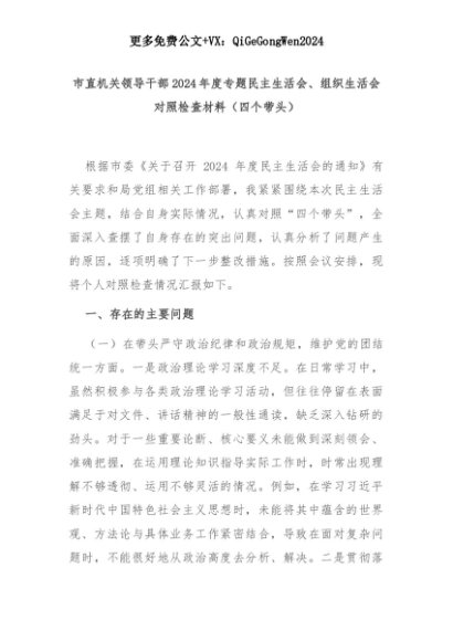 【七哥公文】2025年:市直机关领导干部2024年度专题民主生活会、组织生活会对照检查材料(四个带头)+更多免费公文+VX:QiGeGongWen2024+更多免费公文+VX:QiGeGongWen2024