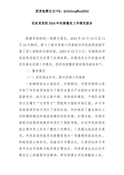 【七哥公文】2025年:民政局党组2024年巡察整改工作情况报告+更多免费公文+VX:QiGeGongWen2024+更多免费公文+VX:QiGeGongWen2024