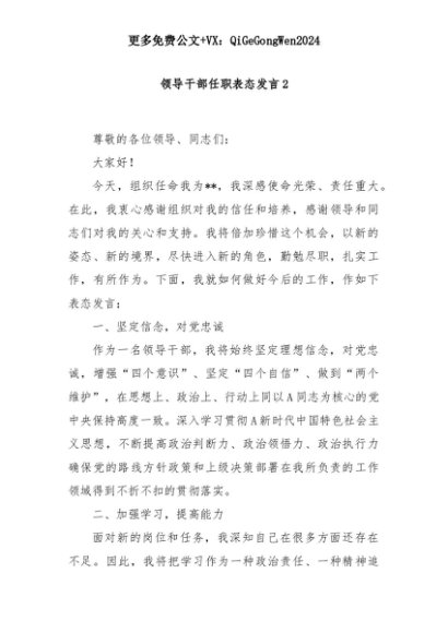 【七哥公文】2025年:领导干部任职表态发言2+更多免费公文+VX:QiGeGongWen2024+更多免费公文+VX:QiGeGongWen2024