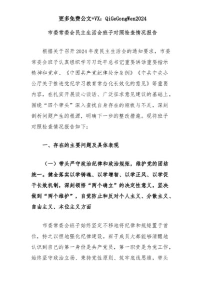 【七哥公文】2025年:市委常委会民主生活会班子对照检查情况报告+更多免费公文+VX:QiGeGongWen2024+更多免费公文+VX:QiGeGongWen2024