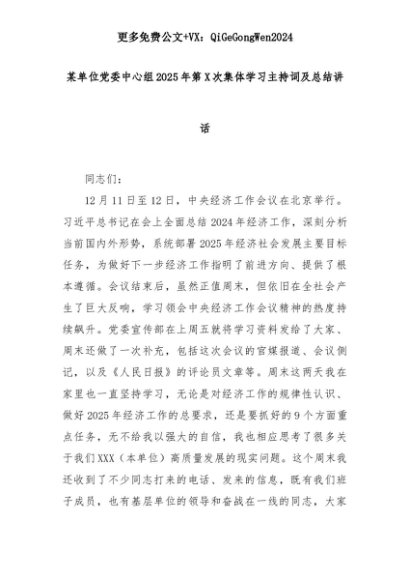 【七哥公文】2025年:某单位党委中心组2025年第X次集体学习主持词及总结讲话+更多免费公文+VX:QiGeGongWen2024+更多免费公文+VX:QiGeGongWen2024