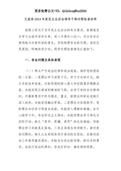 【七哥公文】2025年:文旅局2024年度民主生活会领导干部对照检查材料+更多免费公文+VX:QiGeGongWen2024+更多免费公文+VX:QiGeGongWen2024