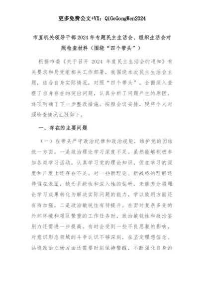 【七哥公文】2025年:市直机关领导干部2024年专题民主生活会、组织生活会对照检查材料(围绕“四个带头”)+更多免费公文+VX:QiGeGongWen2024+更多免费公文+VX:QiGeGongWen2024