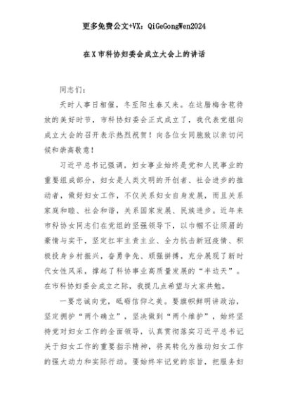 【七哥公文】2025年:在X市科协妇委会成立大会上的讲话+更多免费公文+VX:QiGeGongWen2024+更多免费公文+VX:QiGeGongWen2024