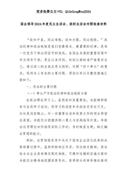 【七哥公文】2025年:国企领导2024年度民主生活会、组织生活会对照检查材料+更多免费公文+VX:QiGeGongWen2024+更多免费公文+VX:QiGeGongWen2024