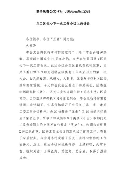 【七哥公文】2025年:在X区关心下一代工作会议上的讲话+更多免费公文+VX:QiGeGongWen2024+更多免费公文+VX:QiGeGongWen2024
