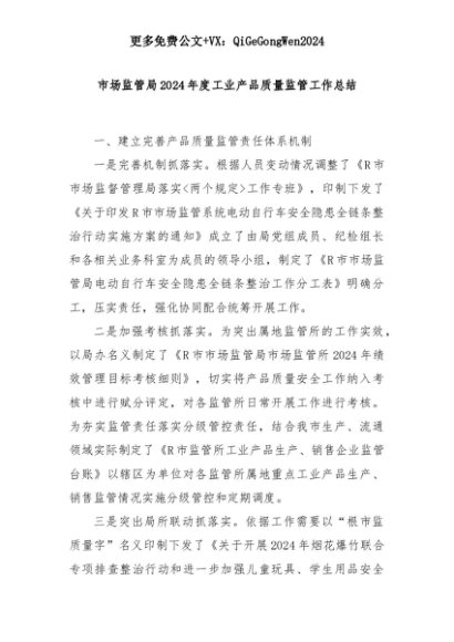 【七哥公文】2025年:市场监管局2024年度工业产品质量监管工作总结+更多免费公文+VX:QiGeGongWen2024+更多免费公文+VX:QiGeGongWen2024
