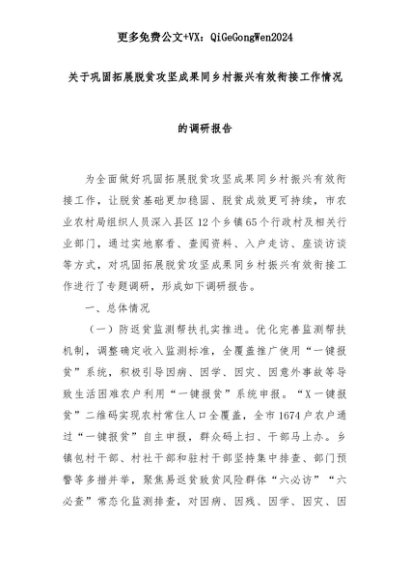 【七哥公文】2025年:关于巩固拓展脱贫攻坚成果同乡村振兴有效衔接工作情况的调研报告+更多免费公文+VX:QiGeGongWen2024+更多免费公文+VX:QiGeGongWen2024