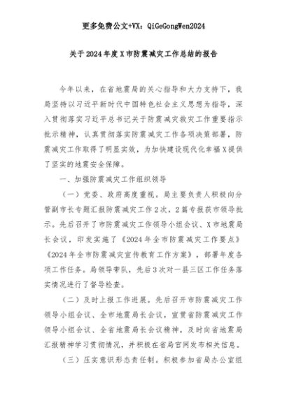 【七哥公文】2025年:关于2024年度X市防震减灾工作总结的报告+更多免费公文+VX:QiGeGongWen2024+更多免费公文+VX:QiGeGongWen2024