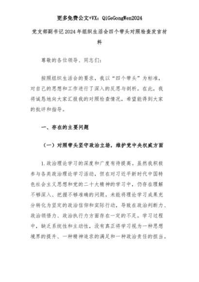 【七哥公文】2025年:党支部副书记2024年组织生活会四个带头对照检查发言材料+更多免费公文+VX:QiGeGongWen2024+更多免费公文+VX:QiGeGongWen2024