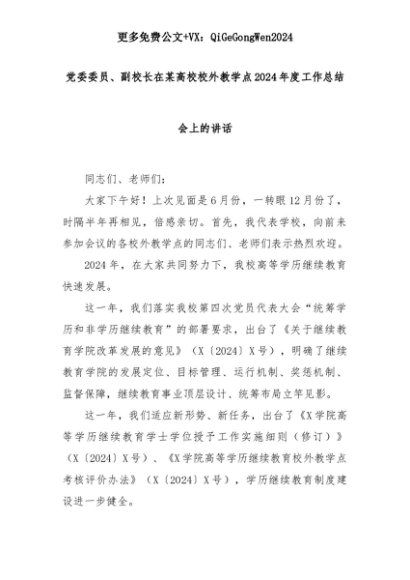 【七哥公文】2025年:党委委员、副校长在某高校校外教学点2024年度工作总结会上的讲话+更多免费公文+VX:QiGeGongWen2024+更多免费公文+VX:QiGeGongWen2024
