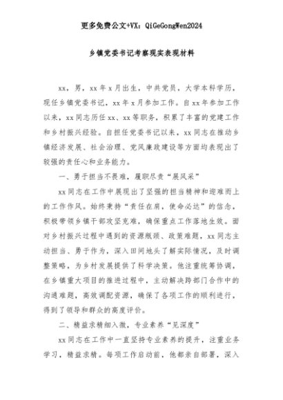 【七哥公文】2025年:乡镇党委书记考察现实表现材料+更多免费公文+VX:QiGeGongWen2024+更多免费公文+VX:QiGeGongWen2024