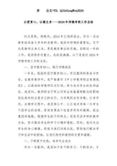 【七哥公文】2025年:以爱育心,以德立身——2024年师德考核工作总结+更多免费公文+VX:QiGeGongWen2024+更多免费公文+VX:QiGeGongWen2024