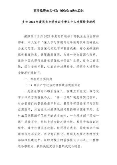 【七哥公文】2025年:乡长2024年度民主生活会四个带头个人对照检查材料+更多免费公文+VX:QiGeGongWen2024+更多免费公文+VX:QiGeGongWen2024