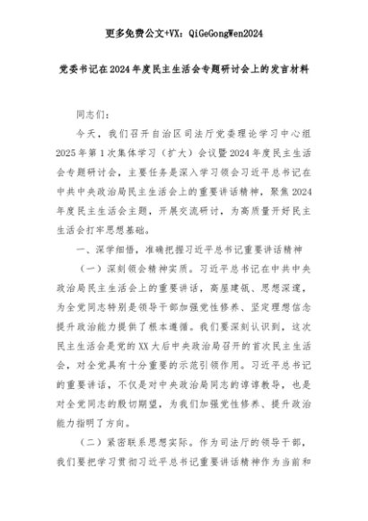 【七哥公文】2025年:党委书记在2024年度民主生活会专题研讨会上的发言材料+更多免费公文+VX:QiGeGongWen2024+更多免费公文+VX:QiGeGongWen2024