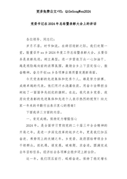 【七哥公文】2025年:党委书记在2024年总结暨表彰大会上的讲话+更多免费公文+VX:QiGeGongWen2024+更多免费公文+VX:QiGeGongWen2024